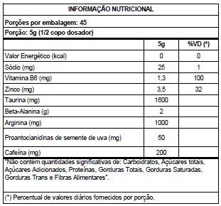 FÓRMULA BETA PUMP: [Beta – alanina, Taurina, Arginina, Cafeína, Extrato seco da semente de uva em pó (proantocianidinas de semente de uva)], Bisglicinato de zinco, Isomaltulose (Palatinose™) , cloridrato de piridoxina (vitamina B6), Acidulante ácido cítrico, aromatizante idêntico ao natural, antiumectante dióxido de sílicio, espessante goma xantana, edulcorante sucralose, corantes artificiais: vermelho bordeaux e azul brilhante. Colorido Artificialmente.NÃO CONTÉM GLÚTEN ALÉRGICOS: PODE CONTER LEITE, OVO, SOJA E AMENDOIM.