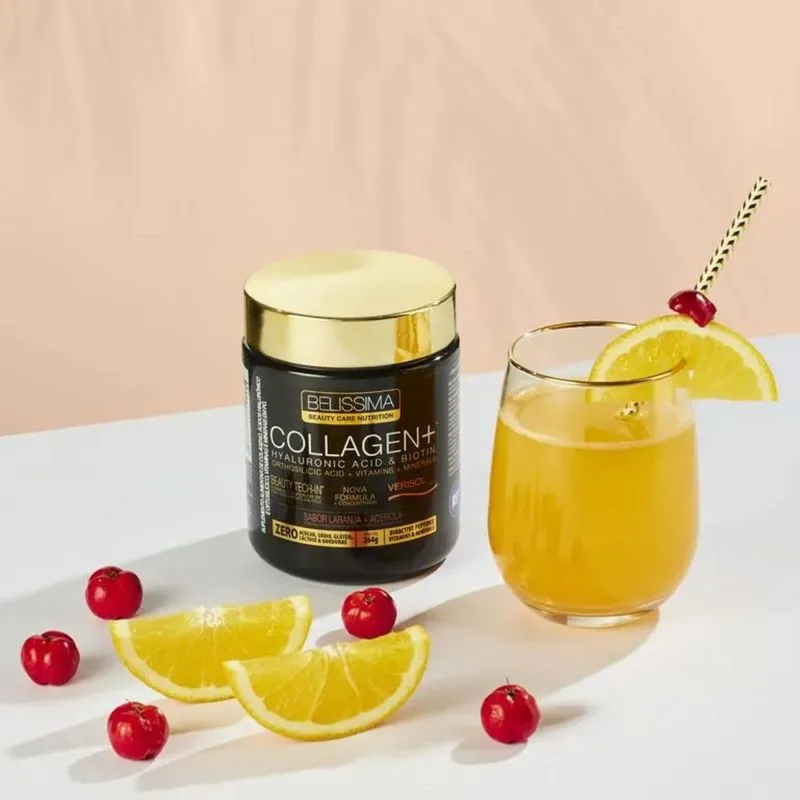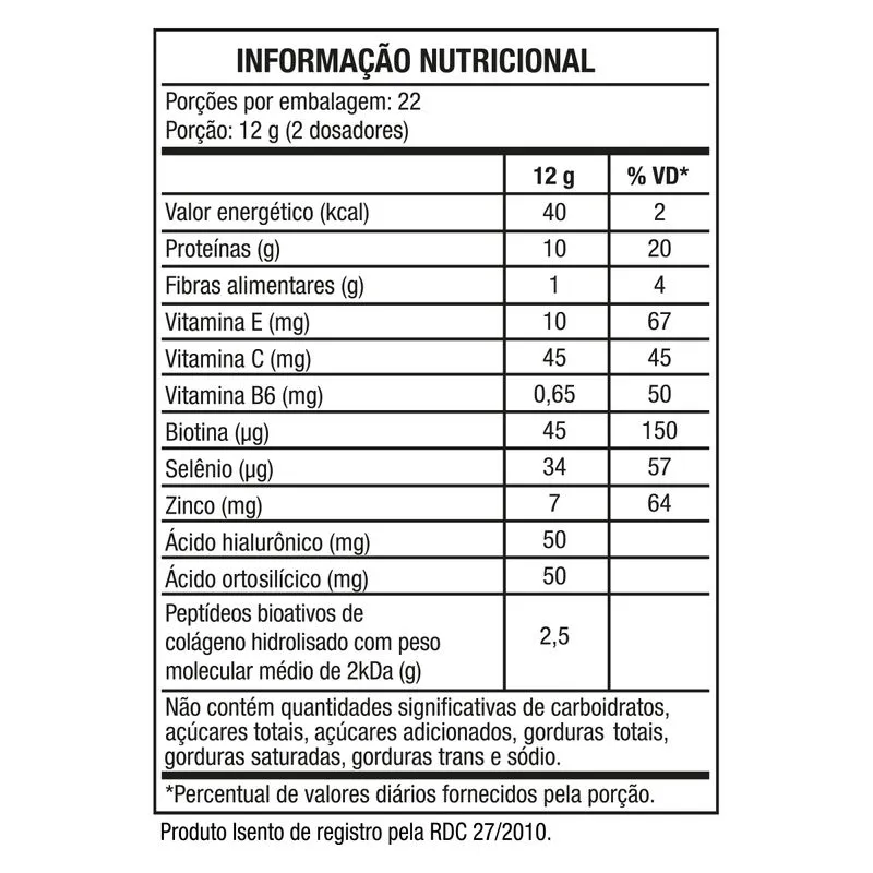 Laranja com acerola: Colágeno peptídico, peptídeos bioativos de colágeno hidrolisado com peso molecular médio de 2kDa (Verisol), polidextrose, mix de vitaminas (óxido de zinco, ácido ascórbico, acetato de D-alfa-tocoferol, selenometionina, D-biotina ), acerola em pó, hialuronato de sódio, ácido ortosilícico estabilizado em cloreto de colina, cloridrato de piridoxina, acidu- lante ácido cítrico, rosas gálicas, aromatizantes, antiumectante dióxido de silício, corante urucum e edulcorante glicosí- deos de esteviol.