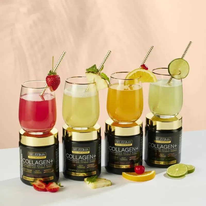 Abacaxi com hortelã: Colágeno peptídico, peptídeos bioativos de colágeno hidrolisado com peso molecular médio de 2kDa(Verisol), polidextrose, mix de vitaminas (óxido de zinco, ácido ascórbico, acetato de D-alfa-tocoferol, selenometionina, D-biotina), hialuronato, ácido ortosilícico estabilizado em cloreto de colina, cloridrato de piridoxina, rosas gálicas, acidulantes ácido cítrico e málico, aromatizantes, antiumectante dióxido de silício, edulcorante glicosídeos de esteviol, corante curcumina.